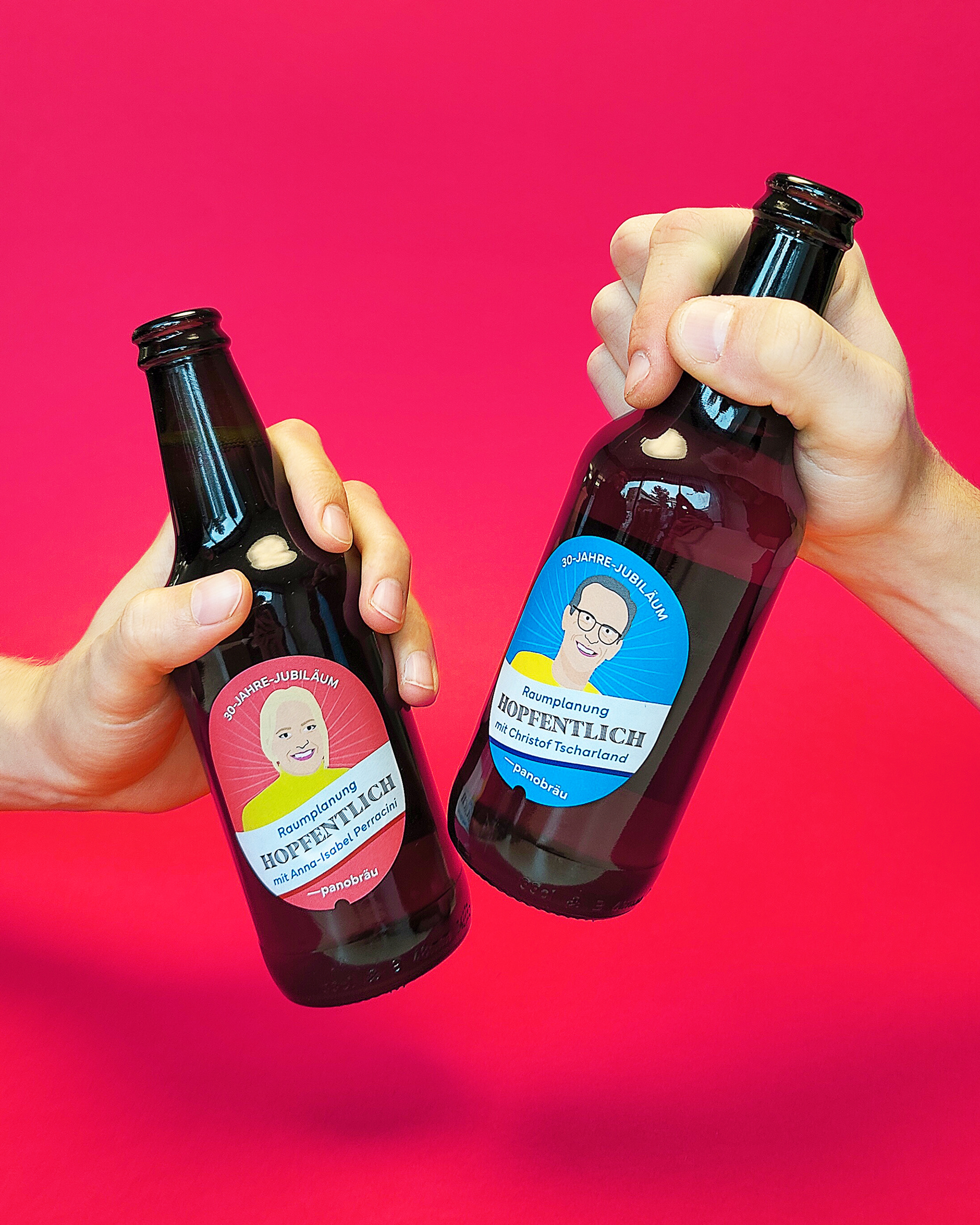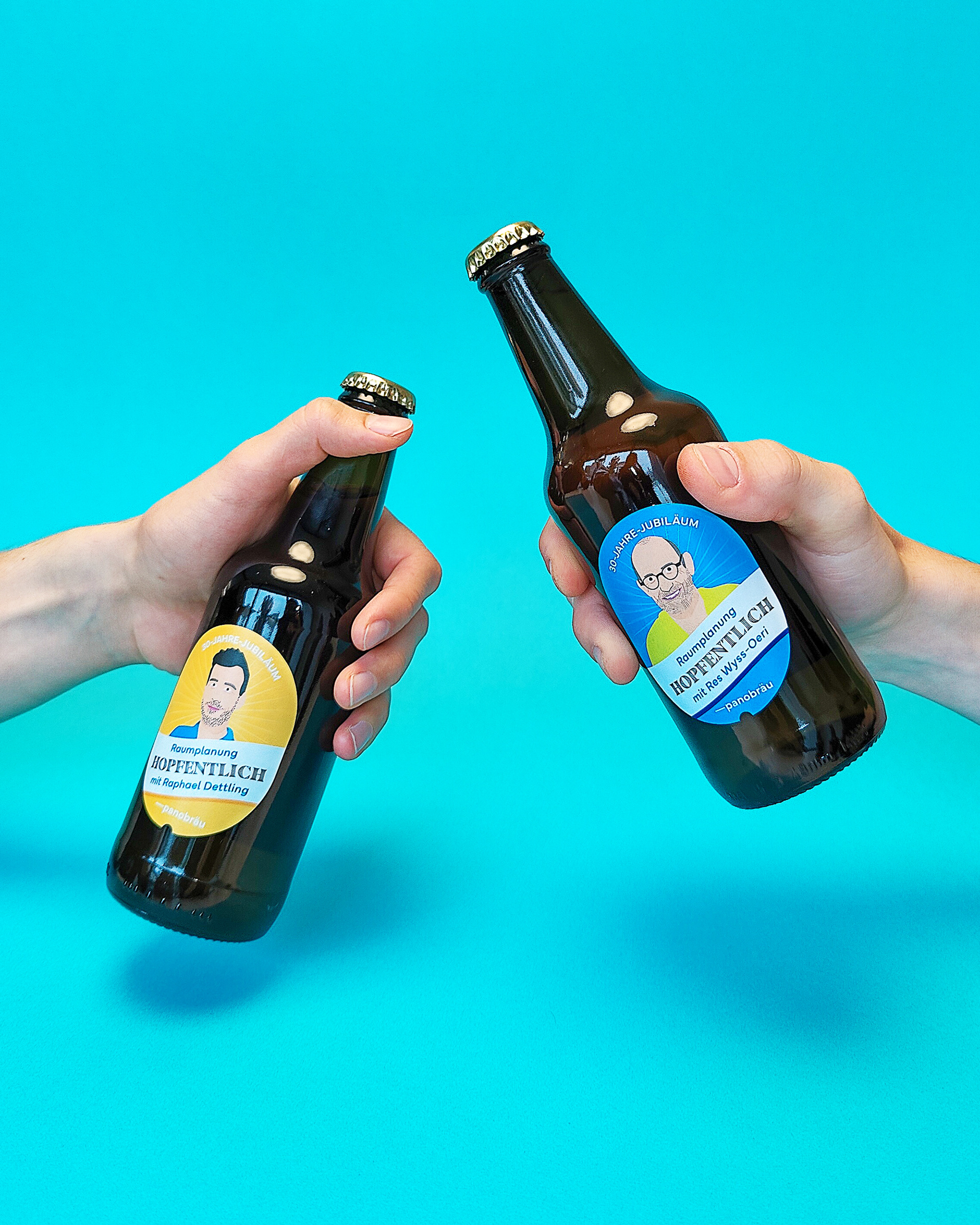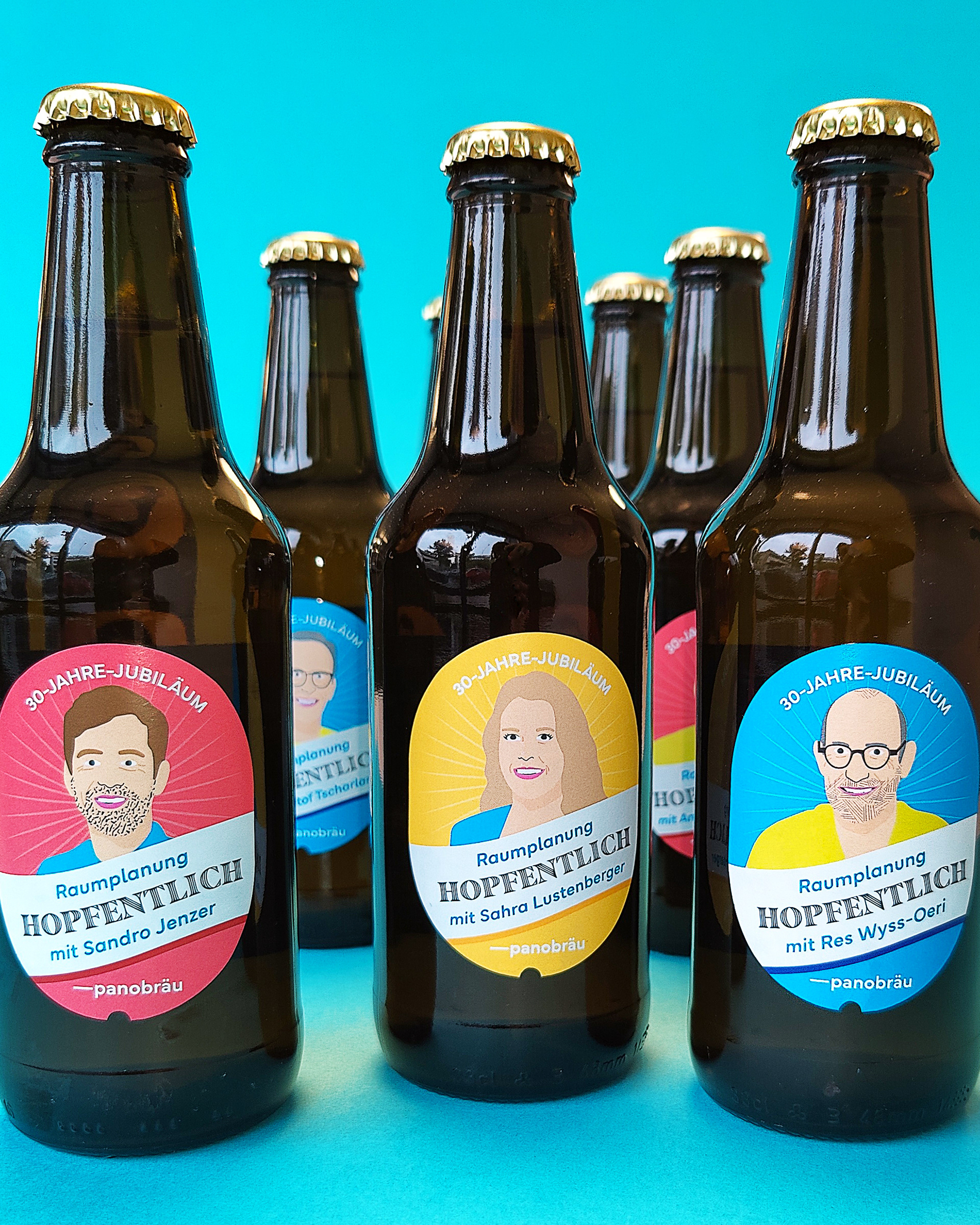 Zum 30-jährigen Jubiläumsfest von Panorama wurden verschiedene Etiketten gestaltet, welche Illustrierte Mitarbeiter*innen Fotos zeigen. Agentur: diff. Kommunikation AG Kunde: Panorama Jahr: 2022